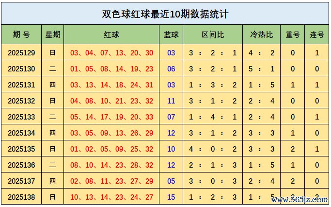 上期回想:双色球第2025138期开出奖号:红球10、13、14、23、24、27;蓝球15,其中红球三区比为1:2:3,开出2枚重号23、27,开出2组连号13、14和23、24,蓝球开出四区号码15。